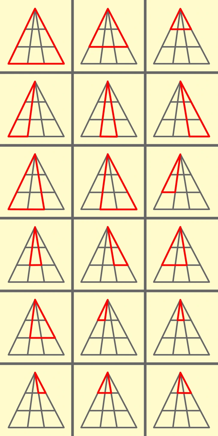 Maintenant que vous connaissez les pièges et la méthode, c’est à vous de jouer. Reproduisez ce triangle subdivisé ou cherchez une version en ligne de ce célèbre défi issu de l’émission britannique Club 1 %. Prenez votre temps, respirez un bon coup et ouvrez grand les yeux. Le nombre total est de 18. Oui, vous avez bien lu, 18 ! Si vous les trouvez tous, votre sens de l’observation et votre logique sont vraiment impressionnants.