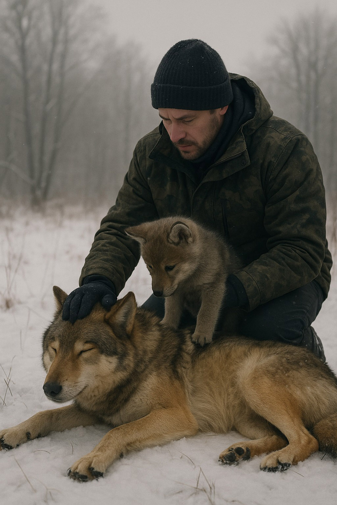 En progressant avec difficulté sur le chemin verglacé, une tache sombre contre la blancheur infinie capta son attention. En se rapprochant, il sentit son cœur se nouer : une louve gisait, visiblement blessée et incapable de bouger, tandis qu’un louveteau apeuré tournait autour d’elle. L’instinct de survie lui soufflait de passer son chemin, car un animal sauvage en souffrance est imprévisible. Pourtant, une force plus profonde, un refus d’être indifférent, l’empêcha de poursuivre sa route.