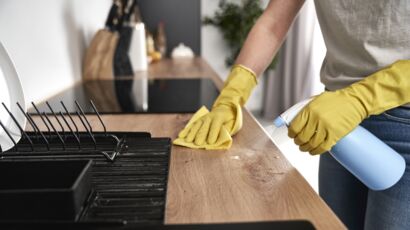Close up of caucasian woman cleaning kitchen at home