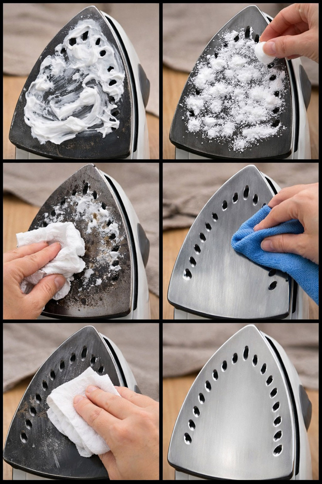 Le duo vinaigre blanc et sel, chauffé à parts égales jusqu’à être tiède, constitue également une alternative puissante. Appliquez cette préparation sur une semelle froide à l’aide d’un chiffon et frottez par petits gestes circulaires. Cette combinaison aide à dissoudre les dépôts incrustés et à redonner de la brillance à la surface.